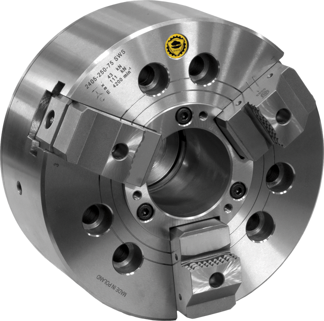 Adapted for short series mass production the BISON Power Chuck with Quick Change Jaw System 2405-250 SWS was designed for turning and grinding operations. A quick change jaw system allows to reduce machine changeover time to a few seconds! The jaws are capable of both internal and external clamping of the workpiece, although there is also a possibility of making the top jaws adapted to different clamping diameters. Moreover, a special insert allows to convert a through-hole chuck into a non through-hole.